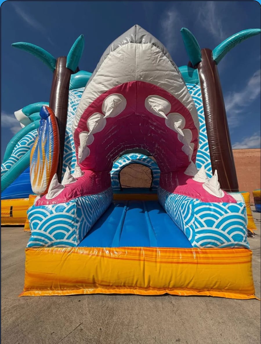 Turn your next party or event into an unforgettable aquatic adventure with the Shark Beach bounce house and water slide combo! Featuring a vibrant teal and white Aztec print with a lively yellow border, this show-stopping inflatable brings a burst of color and excitement to any occasion. With its eye-catching shark theme, kids and adults alike will be thrilled to dive into hours of endless fun. 🦈🌊