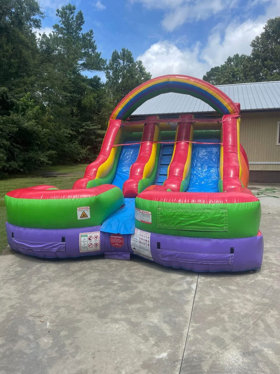 Why settle for one lane when you can have two? The 14 ft Rainbow Bright features a double-lane design, allowing two guests to slide side-by-side for friendly competition and maximum fun. The extra width means more space for everyone to enjoy, making it ideal for larger gatherings. The eye-catching rainbow theme adds a pop of color and excitement to any event, setting the stage for a day full of smiles and splashes!